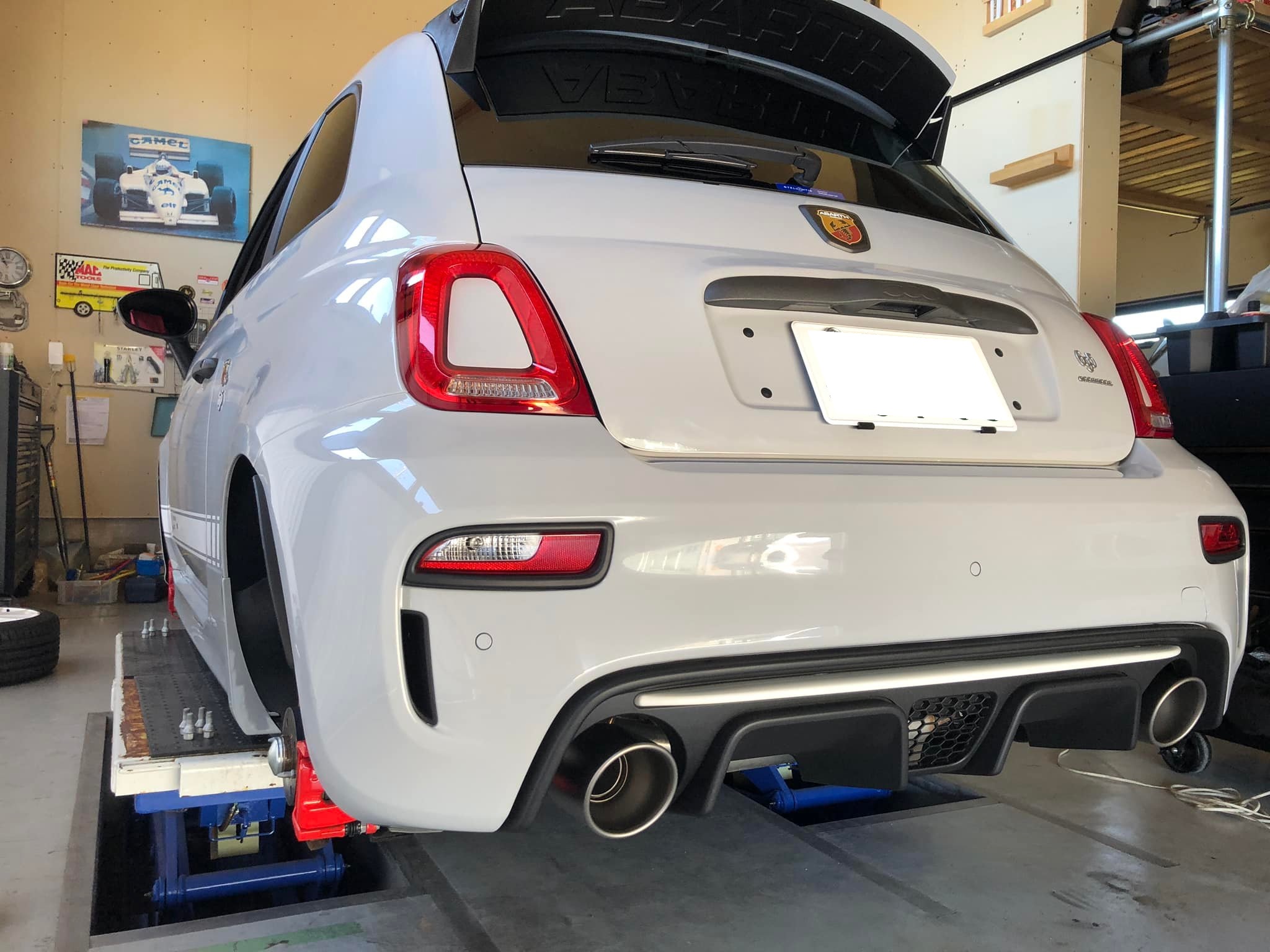 外装は12スポーク17インチアルミホイール・「ABARTH」の文字が刻印された可変式リヤスポイラー・アルミボンネット・ボディカラーはイタリア空軍のグリジオカンポボーロ。